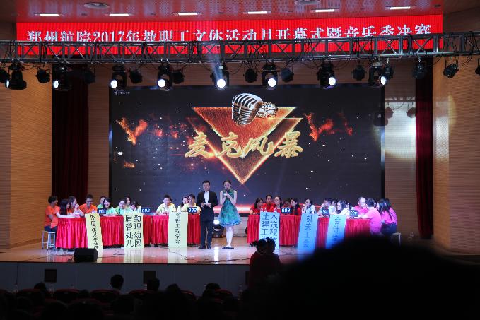 5月8日晚,由校工会主办、艺术设计学院承办的郑州航院2017年教职工文体活动月开幕式暨音乐秀决赛在东校区图书馆第一报告厅隆重举行。校党委副书记石培哲、党委宣传部副部长郝艺娟、工会副主席李进廷、工会女职工委员会主任武坤以及部分基层工会主席应邀参加。 伴随着欢快的音乐、动感的舞蹈,首届教职工文体活动月正式拉开序幕。 石培哲为开幕式致辞,他希望在“文体活动月”活动的各项比赛中,各基层分工会要提高认识、高度重视、精心组织、积极参与;要求参赛队员要拿出良好的竞技状态,迎接竞争的挑战,展现出一流的团队精神,本着“加强交流、展示风采”的宗旨,在比赛中发扬风格,赛出水平,赛出友谊,赛出和谐,为我校“十三五”规划确定的各项目标任务,再展豪情,再建新功!同时希望全体裁判员、评委、仲裁要客观、公平、公正执裁! 此次音乐秀比赛共有16支代表队参加,经过5月2日的预赛选拔,会计学院、外国语学院、管理工程学院、土木建筑工程学院、机关工会、后勤管理处6支代表队进入决赛。 音乐秀决赛共设有我来朗读你来唱、我来比划你来猜、麦克风暴、歌词接龙、势如疾风五个环节,主要考验团队的应变能力、默契配合及对歌曲的表现力和熟悉程度。 各参赛队经过激烈角逐,外国语学院荣获一等奖,后勤管理处、土木建筑工程学院荣获二等奖,会计学院、管理工程学院、机关工会荣获三等奖。 据悉,我校首届教职工“文体活动月”共有音乐秀、书画作品比赛、摄影作品比赛、排舞比赛、篮球比赛、羽毛球比赛、网球比赛七个文体项目。比赛项目内容丰富、组织形式灵活多样,教职工可参与面广,教职工报名参加活动积极踊跃,其中教职工男女篮球共有41支队530名教职工报名参加比赛;音乐秀16支队100余名教职工报名参加比赛;书画、摄影共征集到26个基层工会280余幅作品,都开创了我校此类活动的先河。 此次“文体活动月”的举办将是我校广大教职工展示昂扬向上、奋发有为精神面貌的一个舞台;将是展示我校教职工精神风貌的一道靓丽风景线;将是郑航人陶冶情操、强身健体、表现自我的一次盛会;将是丰富教职工业余文化生活和增强教职工队伍向心力、凝聚力的一部和谐校园建设诗篇。(校工会 裴仁华 图文)