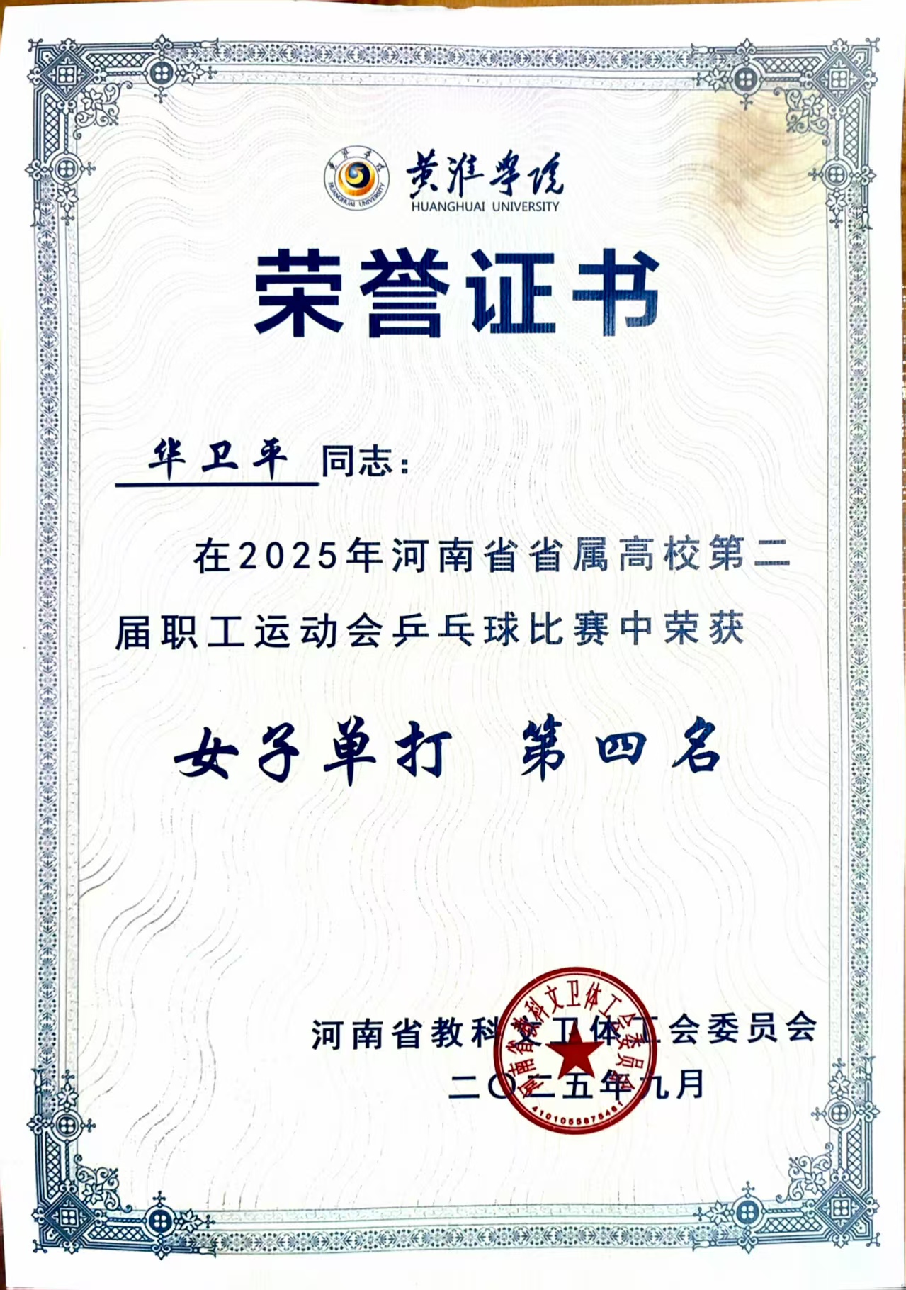 9月19-22日,在河南省教科文卫体工会举办的“百年工运启新程·职工体育绽华彩”河南省省属高校第二届职工运动会——乒乒球比赛中,我校教职工荣获女子单打第四名和团体第八名的优异成绩。