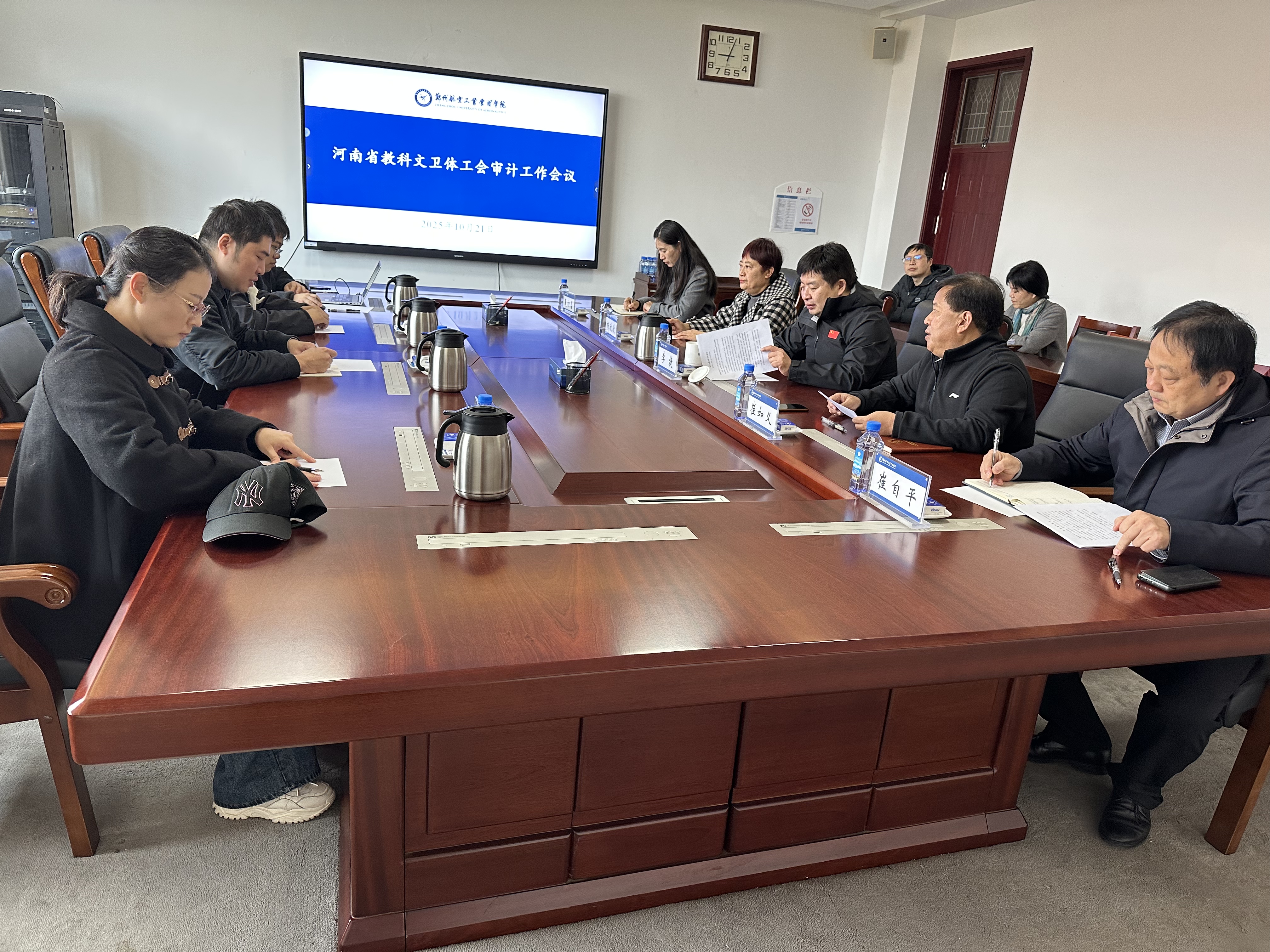 10月21日,河南省教科文卫体工会副主席王晨率审计组到我校对2023至2024年度工会预算执行情况进行检查指导。学校党委副书记、工会主席李捷,工会副主席崔如义、杨欣欣及工会全体成员参加了汇报会。